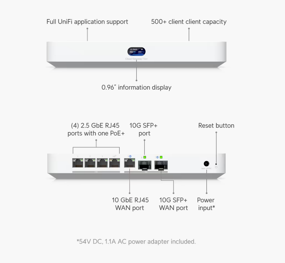 UniFi UCG-Fiber je zmogljiv omrežni gateway/router iz ekosistema Ubiquiti UniFi, namenjen zahtevnejšim domačim ali manjšim pisarniškim omrežjem. Naprava ne vsebuje vgrajenega WiFi oddajnika, kar pomeni, da se lahko ločeno izberejo access point-i, kar poveča fleksibilnost. Ponuja 10 Gbps povezljivost s kombinacijo SFP+ ter RJ45 priključkov, podpira dodatno NVMe SSD shranjevanje (do 2 TB) za snemanje video posnetkov (UniFi Protect) in ostale aplikacije, ter ima bogate varnostne funkcije (firewall, VPN, IDS/IPS), s čimer omogoča napredno upravljanje omrežja.
